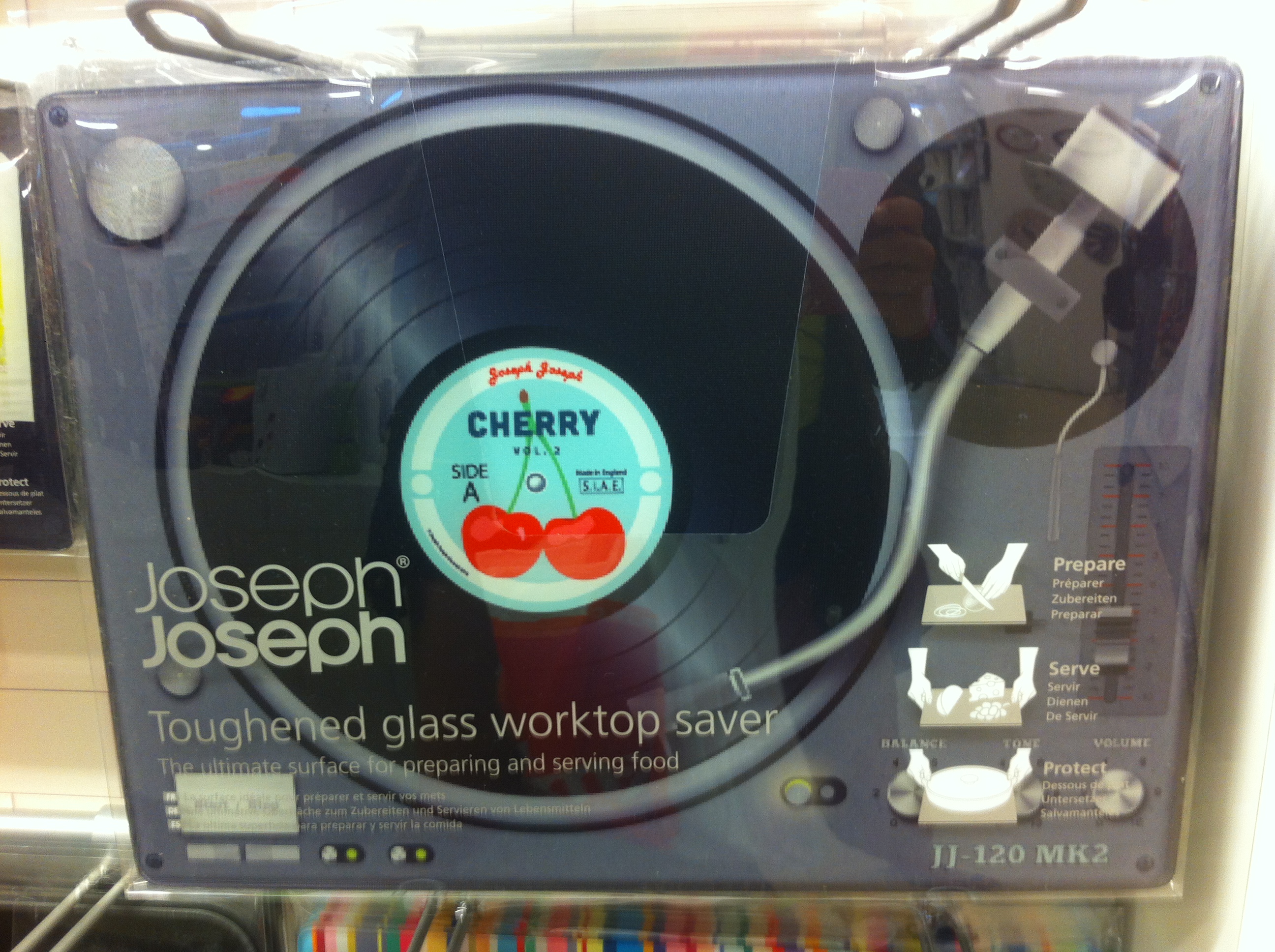 Would anyone choose to slice their vegetables and prepare their meals on a vinyl record? The designers at Joseph seem pretty convinced that many of us would. I received one of these glossy, black (plastic) vinyl-record style cutting boards as a gift recently and am still struggling to accept the item both as a physical artefact and concept. Anyone old enough to remember buying vinyl records might, like me, feel somewhat uncomfortable with the idea of brandishing a knife near such a thing. Sure, I know it’s not a real record, and I know it’s designed as a work surface saver and so theoretically is built to withstand the scratches and scrapes inevitable in the lifecycle of a chopping board. So should I display it and not use it then? Certainly, as some of its owners on Amazon proclaim, it’s best kept as a decorative item, hopefully bestowing a moderate measure of cultural capital upon its owner and perhaps even adding a little je ne sais quoi to their culinary creations. For me though it’s just another example of what Simon Reynolds has labelled ‘retromania’, a response to the trend which sees us longing for the past, in an age of hipsters, vintage chic and retro fashion. But that’s exactly the problem for me, it’s NOT a record, and it’s definitely not vintage, so how can it bestow value, even as a symbolic item? The semiotics of popular music, along with its many genres and subgenres are complex and ever-changing, but it’s clear that this item is meant to act as an eye-arresting, although hopelessly silent and static, nod to the hip associations of popular music. For me, a vinyl record is one thing and a cutting board is another; I’m afraid to say I’ll be giving this one the chop.